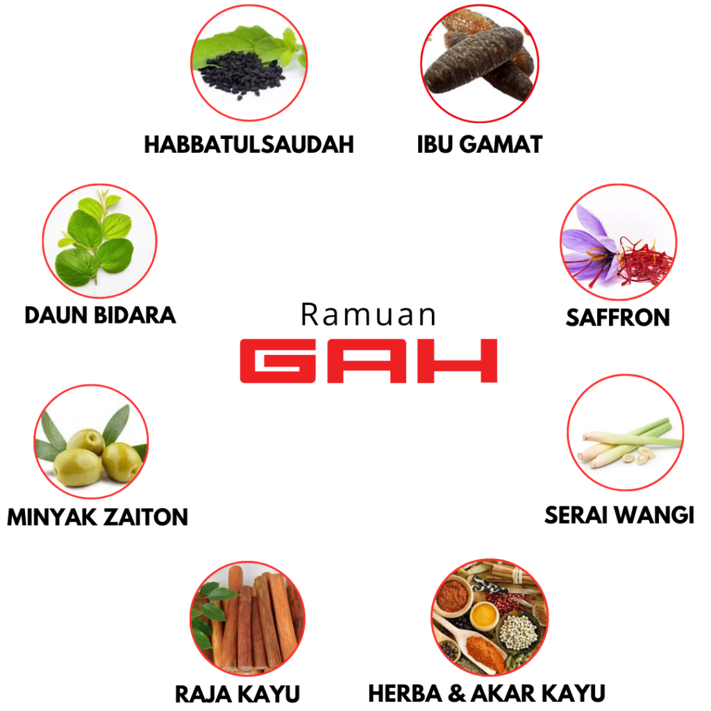 Minyak GAH diadun dengan Gamat dan 30 herba, Akar Kayu yang terpilih dan digabungkan dengan Nano Teknologi dari Jerman yang membuatkan fungsinya lebih pantas dan berkesan. Ramuan semula jadi yang digunakan secara turun- temurun tanpa kesan sampingan.